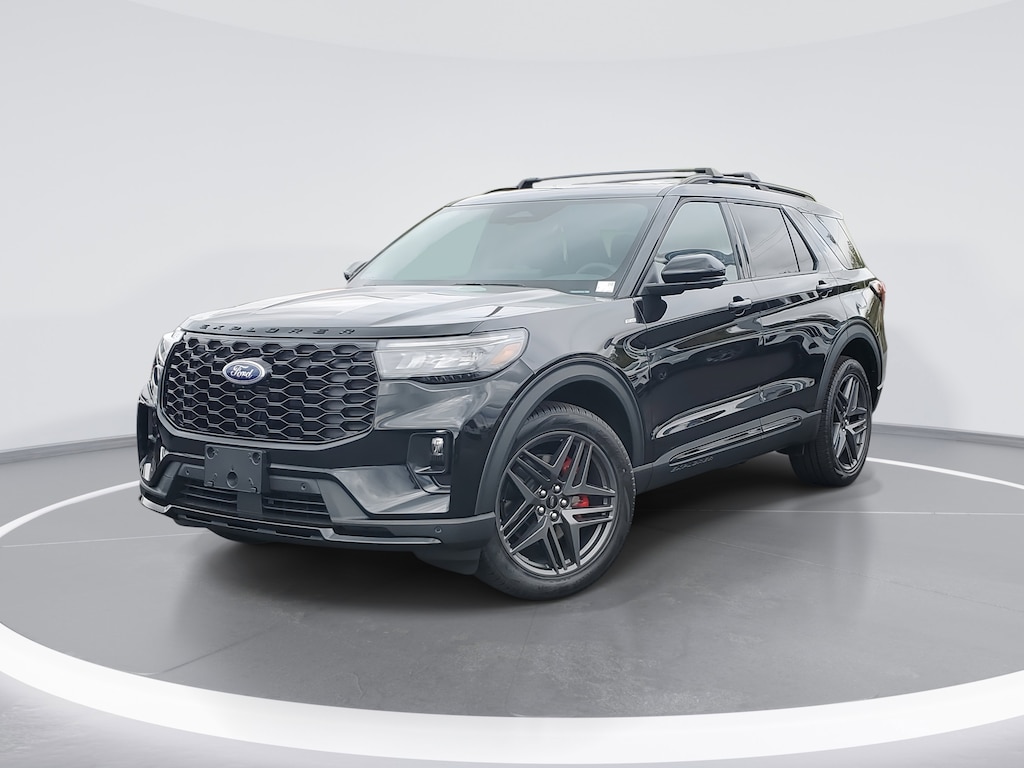 Agate Black Metallic 2025 Ford Explorer ST-Line 4WD 10-Speed Automatic 2.3L EcoBoost I-4 4WD, 110V/150W AC Power Outlet, 2nd Row Heated Seats, Ambient Lighting, Auto High-beam Headlights, Auto-Dimming Interior Rear-View Mirror, Automatic temperature control, Equipment Group 300A Standard Package, Exterior Parking Camera Rear, Fully automatic headlights, Heated steering wheel, Memory Driver's Seat, Panoramic Vista Roof w/Power Shade, Performance Brakes, Power Liftgate, Power-Folding Sideview Mirrors w/Autofold, Premium Package, Radio: B&O Sound System by Bang & Olufsen, Rain-Sensing Wipers (Front Only), Red Painted Perf Front & Rear Brake Calipers, ST-Line Street Pack, Wheels: 21 Magnetite-Painted Aluminum, Wireless Charging Pad.